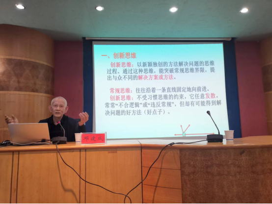 讲座中,邓建成教授首先介绍了思维创新的基本概念,然后结合自身经历和所教学生的人生轨迹,详细阐述了组合思维、联想思维、交换顺序思维、逆向思维和超前思维这五种创新思维的主要形式。在此基础上,邓教授将创新思维与科研、教学相结合,探讨了思维创新在新材料开发、教学改革以及大学生创业上的应用。最后,邓教授以自己在职业发展历程中遇到十字路口所做的选择和各种实例,启发青年教师一定要把握好人生的几个转折点,要给准确自己定位。