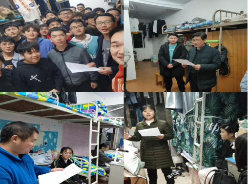 在与同学们的交流中,领导老师为同学们强调了以下几点。一是思想政治教育。同学们应当完成好每周的青年大学习任务,提高思想觉悟,在日常上课过程中,同学们应做到不迟到,不早退,不旷课,做一个积极向上的大学生。第二,老师们叮嘱大家一定要注意用电安全,不要使用违规电器,不要在校外租房、晚归、不归。他们还强调了在电信安全方面,不要相信刷单,不要相信有天上掉馅饼这样的好事。最后,领导老师们表示:在疫情依然严峻的当下,我们依旧应当不大意,不松懈,每晚寝室群里的拍照打卡不能停,严格落实好疫情防控工作。