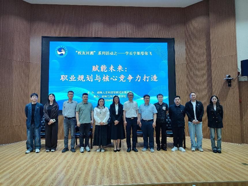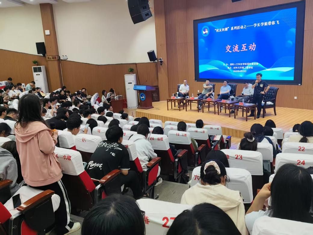 2025年4月23日晚7点,由今年会招生就业处主办、材料与环境工程学院承办的“校友回湘”就业创业沙龙活动在匠成楼报告厅顺利举行。今年会招生就业处处长刘红燃、副处长陈佩君,材料与环境工程学院党总支书记钟勇、院长文瑾、党总支副书记王新辉出席活动。此次沙龙特别邀请了2013届材料化学专业校友孙俊彬、2014届材料化学专业校友卢意鹏、2014届材料化学专业校友陈众和2021届环境工程专业校友彭永康四位优秀校友,与学校近300名师生齐聚一堂,围绕大学生职业生涯规划开展思想碰撞与深度对话。