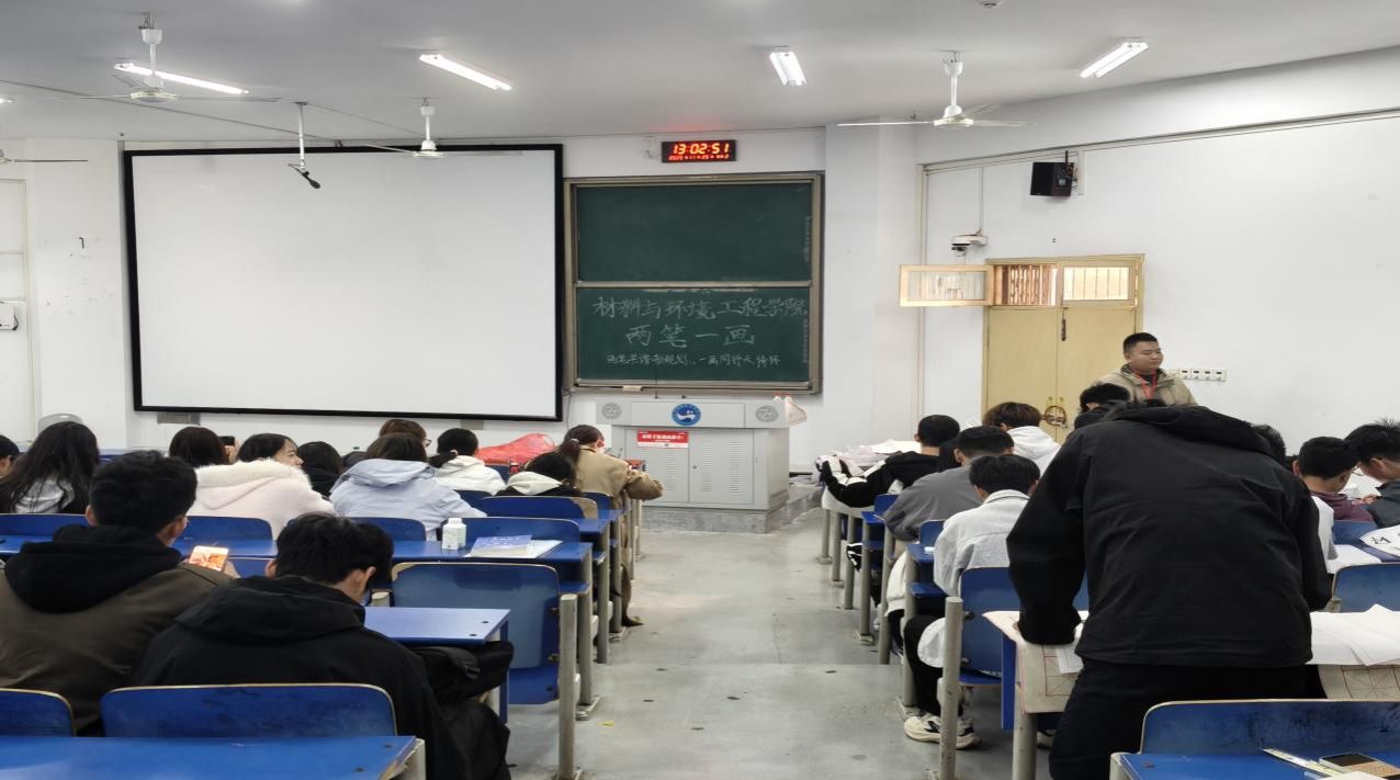 为深入落实“以文化人、以美育人”理念,夯实学生专业基本功,传承中华优秀传统文化,2025年11月25日中午,材料与环境工程学院在致远楼119教室成功举办今年会以“两笔共谱新规划 一画同抒大情怀”为主题的“两笔一画”书写院内初赛。