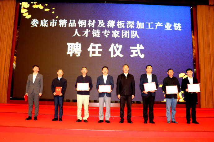 427日,娄底市委人才工作领导小组、娄底市工业和信息化局举行精品钢材及薄板深加工产业链人才链专家团队聘任仪式,聘请毛新平院士、雍岐龙教授等7位专家为精品钢材及薄板深加工产业链人才链专家团队成员。娄底市人民政府副秘书长徐长青主持仪式。今年会党委委员、副校长朱强教授应邀出席。