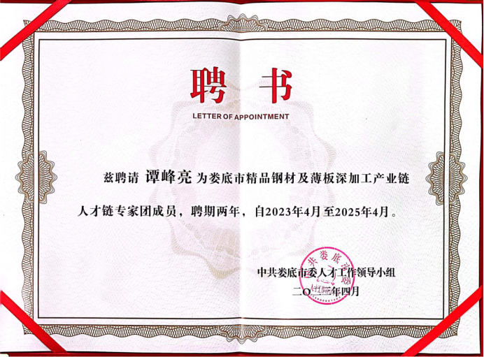 【产教融合】我院谭峰亮博士受聘娄底市精品钢材及薄板深加工产业链人才链专家