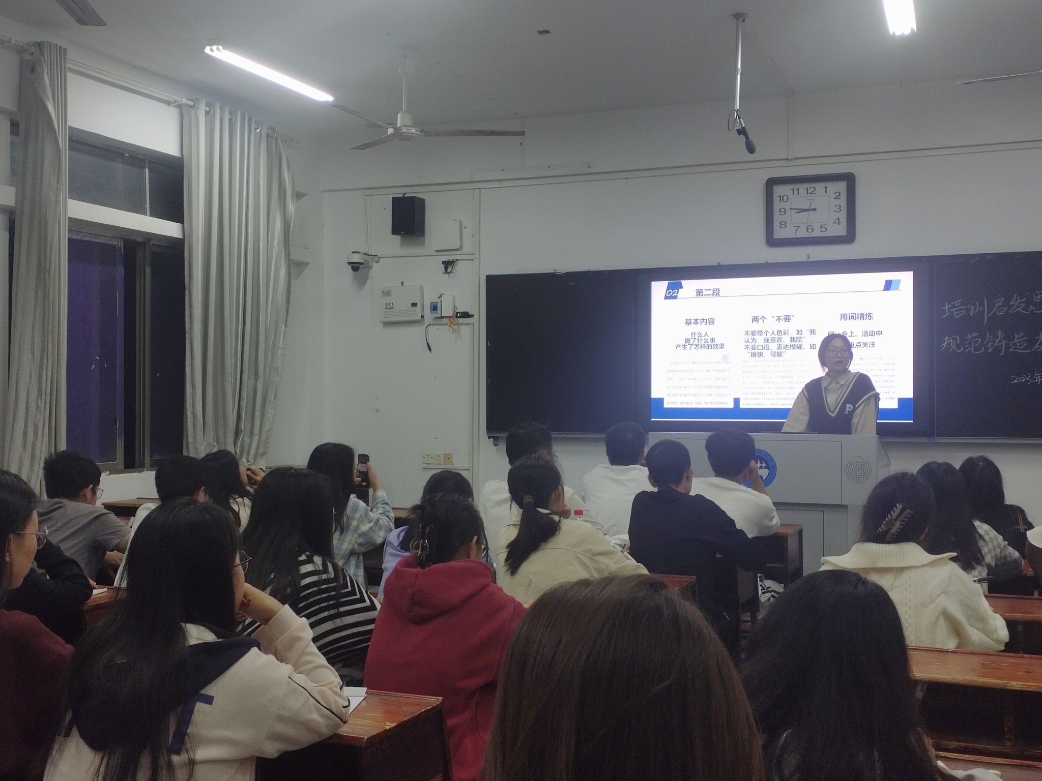 培训共开展四次。王睿博、郑子康、雷雯雯分别围绕推文编辑、短视频拍摄构图以及新闻策划、选题采写等方面进行详细讲解,并结合自身实践经验,辅以大量生动具体的视频、图片实例,用深入浅出、精彩生动的讲授,教大家写好新闻作品,优化推文编辑排版,将视频拍摄得鲜活且富有感染力。