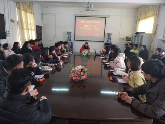 会议开始,刘嘉琪主席带着大家一起回顾了2017年学生分会日常工作的点点滴滴,有点赞、有反思、有鼓励。新的学期,嘉琪主席对于分会的工作重心也做了精心地安排和部署。她要求全体学生干部要在原有的工作基础上进一步推动我院学生文明习惯养成“三个一” 特色活动,把它作为亮点来抓。同时主席要求分会各部门之间要分工协作,创建和谐愉快地工作气氛和热情。会议中,各个部门都派了代表发言谈了自身及部门整体的工作收获和今后努力的方向。做到爱岗敬业地“钉子”精神。会议最后,学院辅导员陈佩君老师做了见一个简短而接地气的总结,她强调了学生分会干部的团队建设和干部生涯规划,并对分会全体学生干部寄语“不想当将军的士兵不是好士兵”。