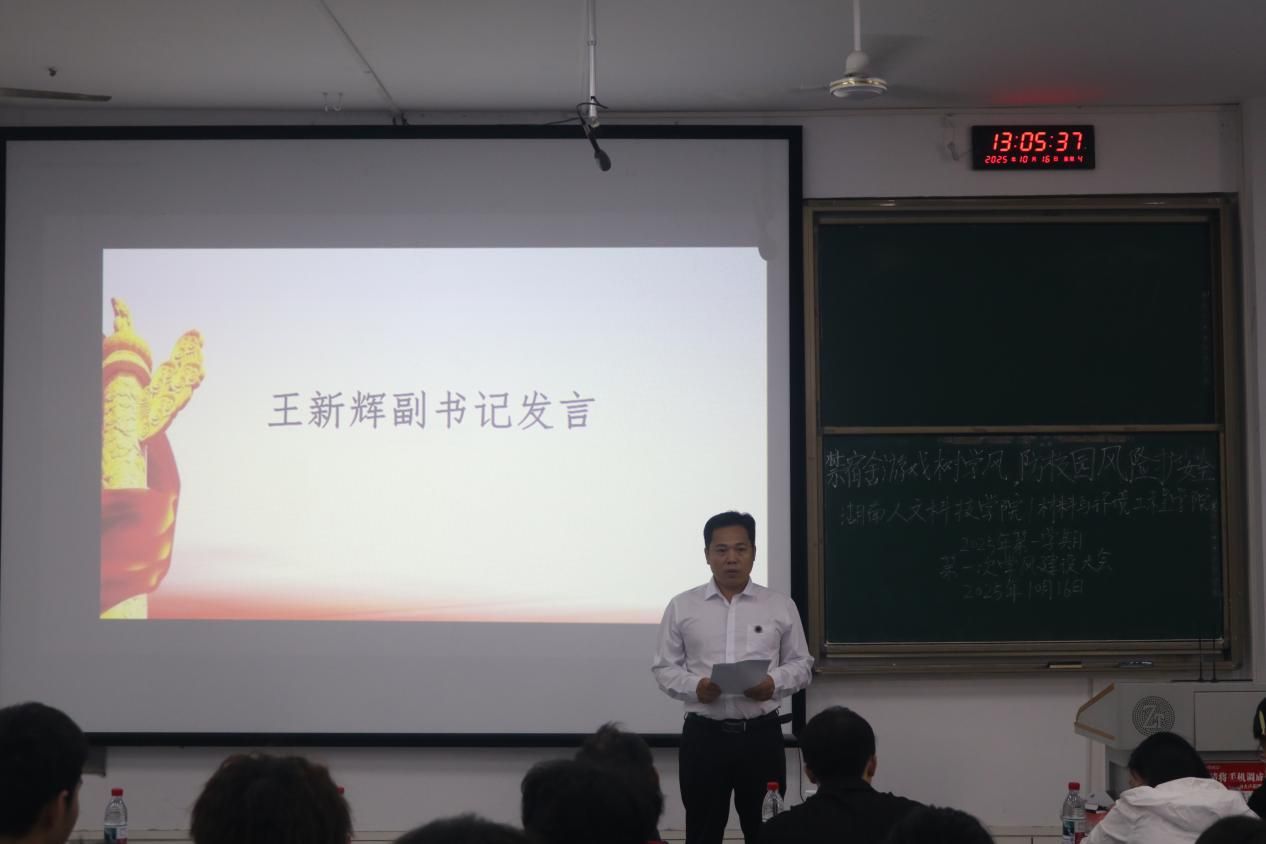 大会伊始,团学会代表朱天豪发言,强调身心健康与良好学习习惯对优良学风的关键作用,呼吁同学们以行动践行自律,共筑积极学习氛围。随后,辅导员刘佳俐老师对即将到来的评优评先工作强调各班务必做到公平、公正、公开,同时明确校纪校规中关于学业、课程等系列要求,呼吁班委提醒同学们大学以学习为重。接着,王新辉副书记聚焦宿舍学风建设,剖析沉迷游戏对学业的不良影响,从时间管理、目标意识、自我管控等方面提出要求,同时提出学院将以下寝实查、监督互促、考评管理等方式推动优良学风落地。本次大会同步表决《宿舍文明公约》并获得通过,即日起以班级为单位下达公约相关通知并正式实行,呼吁同学们自觉遵守。大会接近尾声,钟勇书记对同学们提出两点期望:一是积极参与社会实践,拓展综合能力;二是班委发挥模范作用,主动劝阻违纪行为、凝聚正向班级氛围。最后,学习实践部李雅通过PPT开展校园安全教育,围绕反诈骗宣传、宿舍消防安全、网络安全、交通安全四个板块,明确行为规范、强化安全意识,呼吁全体同学践行安全准则,并请与会班委将安全教育内容与精神传达至班级同学。