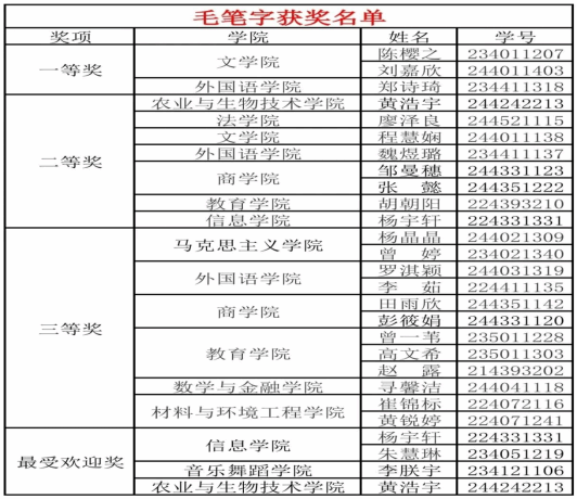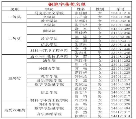 “两笔一画”活动的开展激发了广大学生对艺术创作的热情。选手们不同的笔触和线条都让人得以领略艺术的风采。在此,让我们特别恭喜化学B20221崔锦标,化学B20222黄锐婷获得非专业组毛笔字三等奖,化学B20232李佳,材科B20232张宋林获得非专业组钢笔字二等奖,化学B20232刘芷榕获得非专业组钢笔字三等奖,材科B20242谭曼妮、材化B20242刘乐遥获得非专业组简笔画一等奖,化学B20241雷莹获得非专业组简笔画二等奖,化学B20241赵心怡获得非专业组简笔画三等奖和最受欢迎奖。
