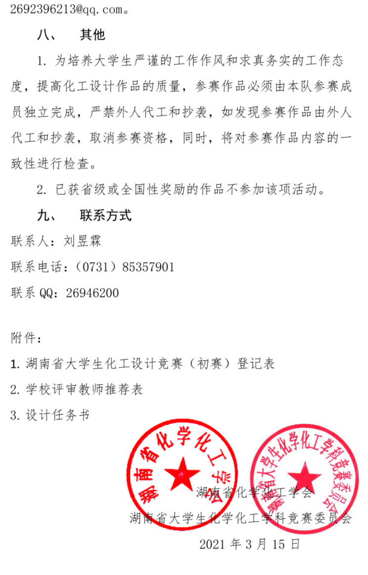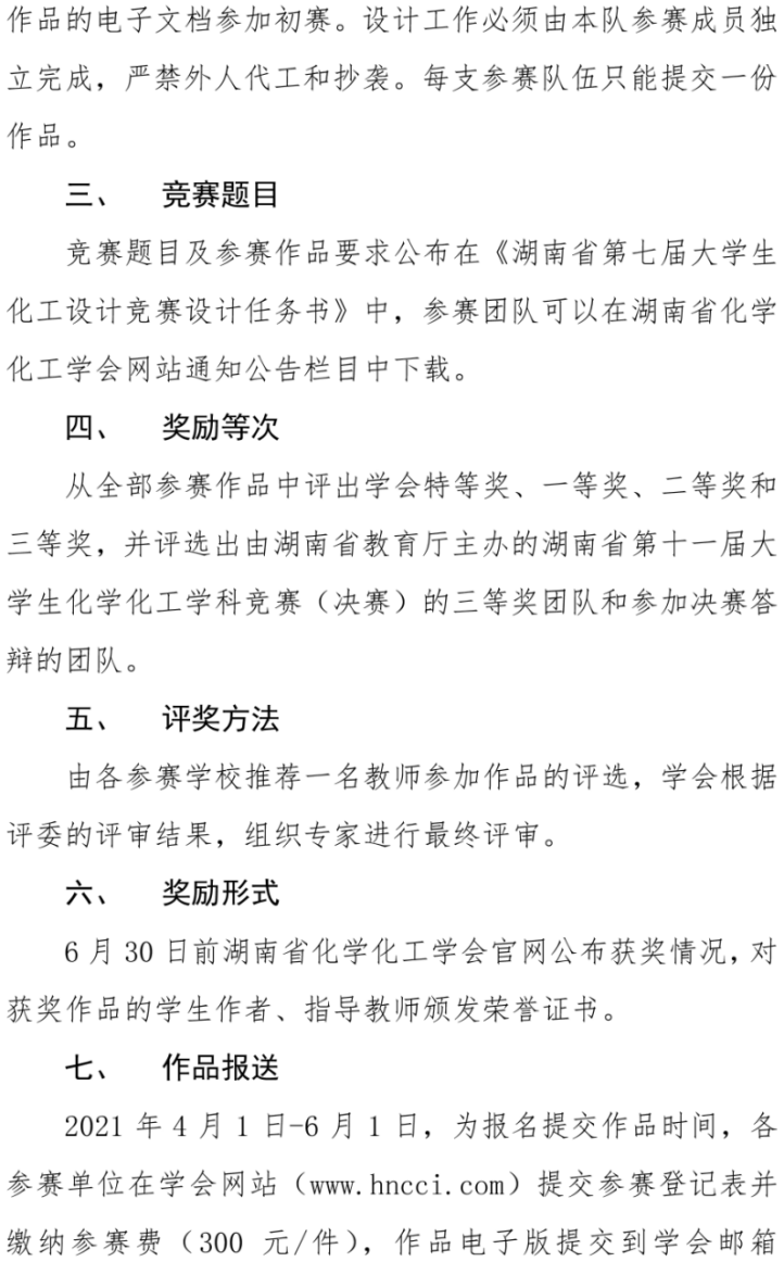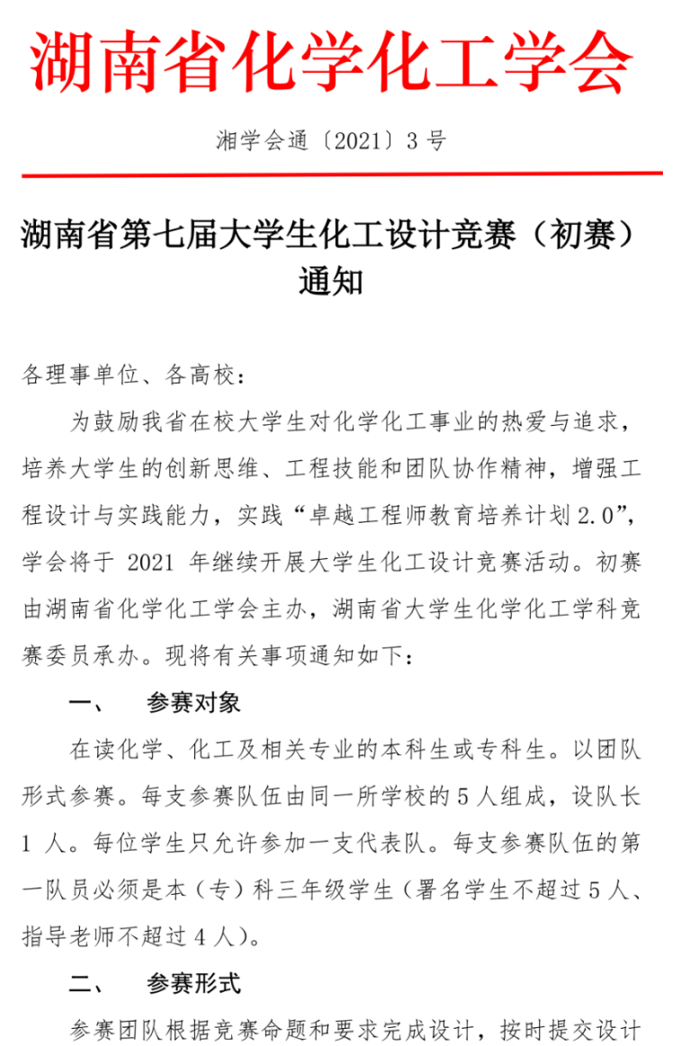 湖南省第七届大学生化工设计竞赛(初赛)通知