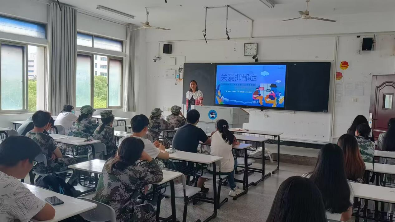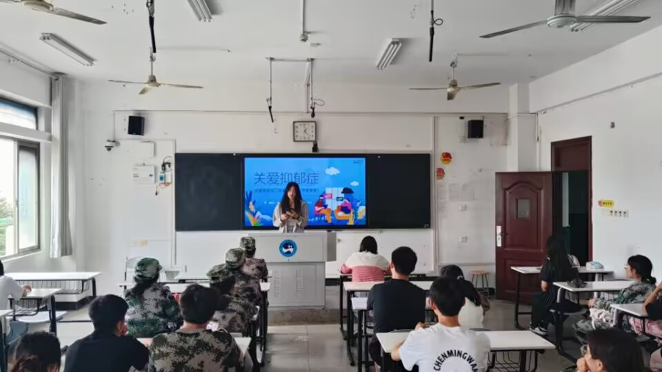 (辅导员朱舒腊在台上讲述如何“防抑”)