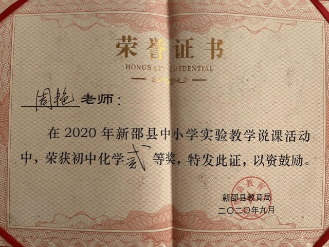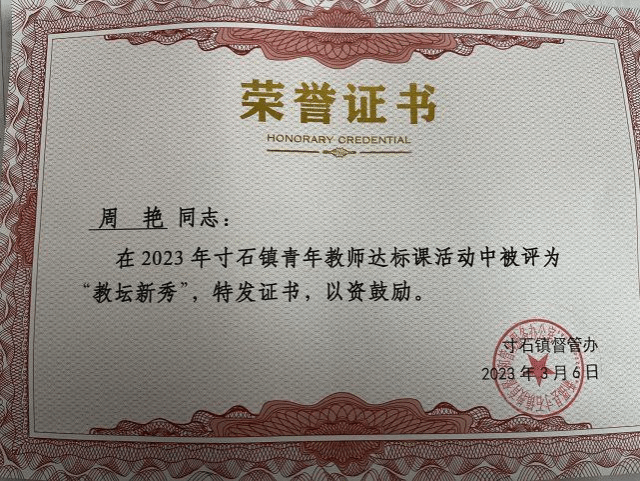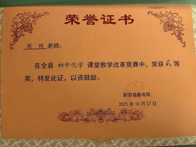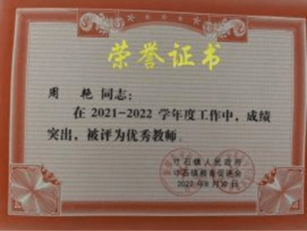 周艳,2020年毕业于今年会材料与环境工程学院化学专业;2023年获评寸石镇“教坛新秀”;寸石镇2021-2022学年优秀教师;寸石镇2021年下学期教学比武一等奖,新邵县2021年初中化学课堂教学改革竞赛二等奖;2020年新邵县中小学实验教学说课初中化学二等奖。