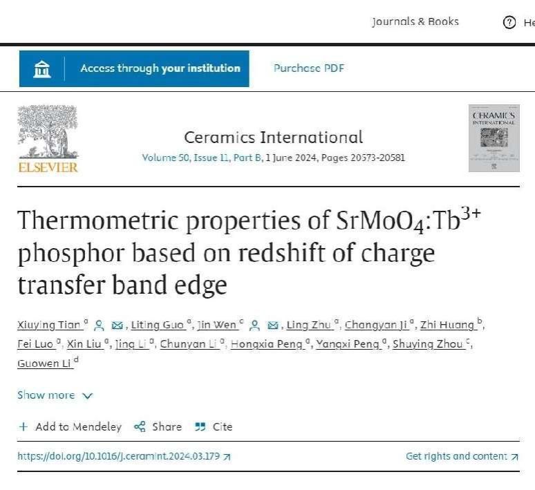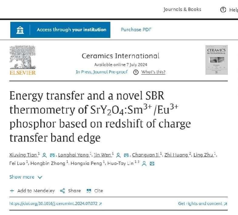 近期,在世界陶瓷科学院林华泰院士和文瑾教授的带领下,材料与环境工程学院田修营博士牵头连续在Top期刊《Ceramics International》发表两项重要研究成果——Thermometric properties of SrMoO4:Tb3+ phosphor based on redshift of charge transfer band edge和Energy transfer and a novel SBR thermometry of SrY2O4:Sm3+/Eu3+ phosphor based on redshift of charge transfer band edge。