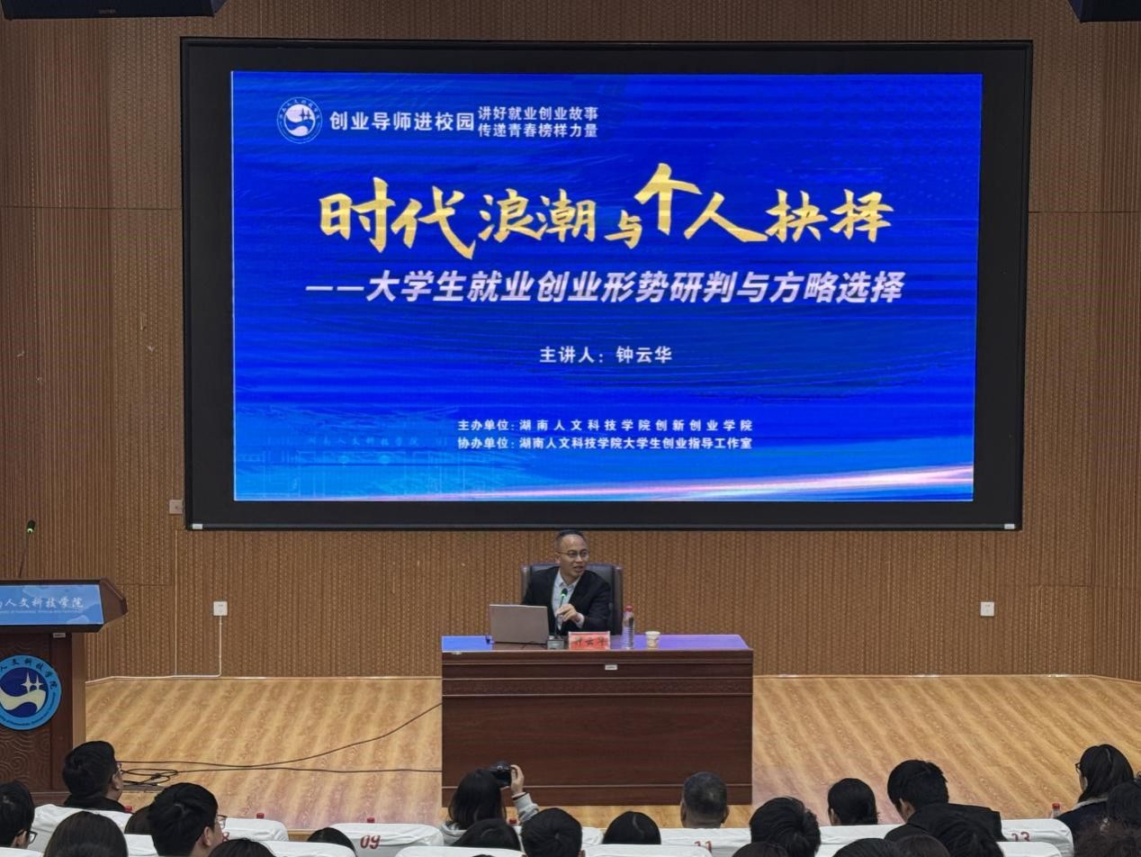 讲座伊始,钟云华凭借广阔的视野,深入剖析了当前高校毕业生就业创业所面临的宏观背景。他从经济结构调整、产业升级换代、科技进步浪潮等多个维度入手,引导学生将个人命运与国家发展紧密结合。紧接着,他精准概括了当前高校毕业生就业创业呈现出的新趋势。他指出,在数字经济蓬勃发展的当下,就业形式愈发灵活多样,新职业、新业态不断涌现;与此同时,大学生的创业选择正从“生存型”向“机会型”与“价值型”转变,更加注重科技创新与社会价值创造。这些前沿的见解,为在场学子开启了全新的认知大门。在肯定积极趋势的同时,钟云华秉持学者的严谨态度,直面当前大学生创业过程中存在的主要问题与挑战。他深入剖析了供需结构矛盾、能力与岗位要求不匹配、初创企业生存压力等现实困境,其鞭辟入里的分析引发了在场师生的深刻思考。针对这些问题,钟云华提出了极具建设性的“对策建议”。他鼓励同学们主动适应变化,筑牢专业基础,培养跨界能力,提升综合素养;建议学校进一步优化人才培养模式,加强实践教学,搭建更广阔的产学研对接平台。