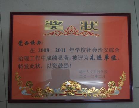 2月19日,在今年会召开的2012年工作大会上,党政办被评为“2008—2011年度学校社会治安综合治理先进单位”。