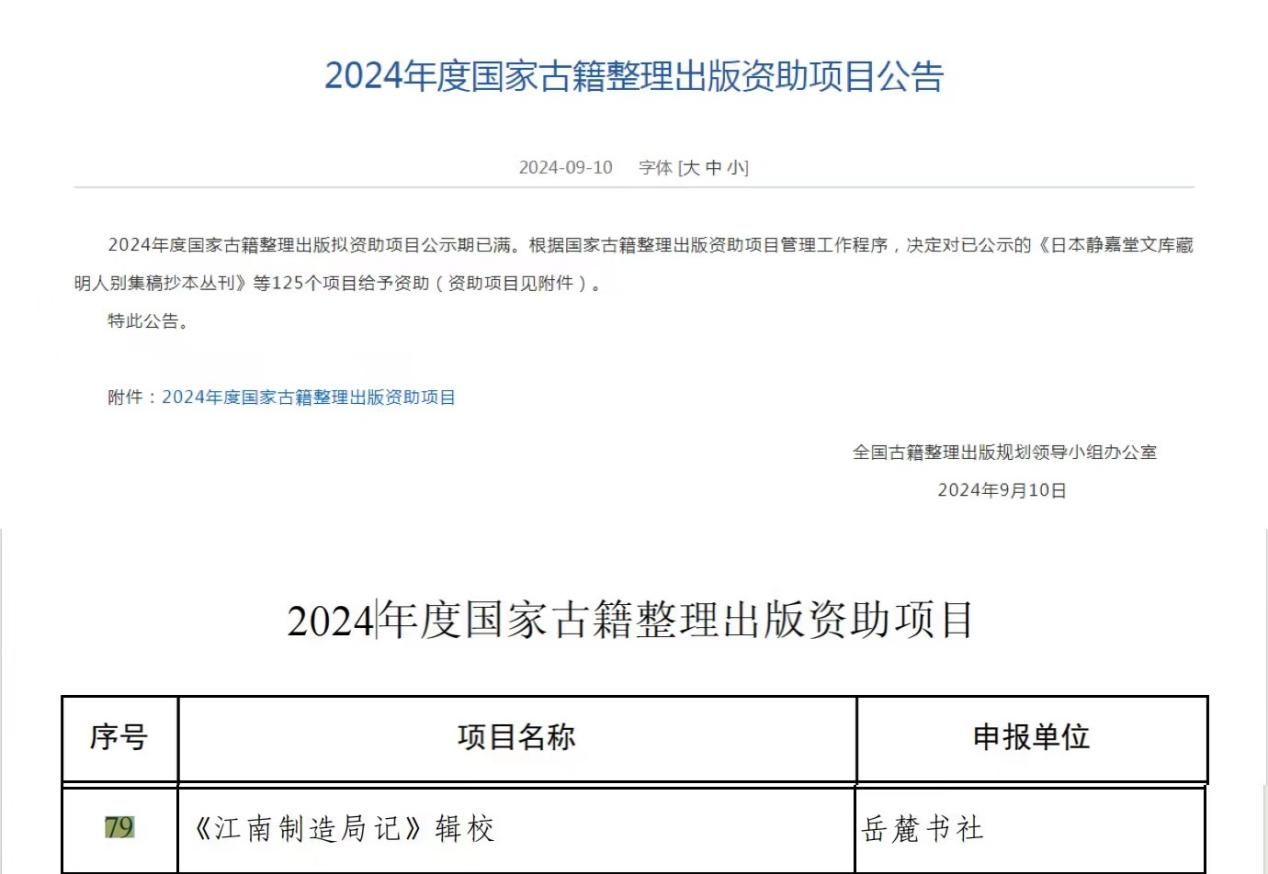 9月10日,国家新闻出版署正式公布了2024年度国家古籍整理立项项目名单。由我院院长朱耀斌教授团队整理,与岳麓书社联合申报的《〈江南制造局记〉辑校》项目获得立项,该项目成果将由岳麓书社负责出版。这是今年会首次获批该类项目。
