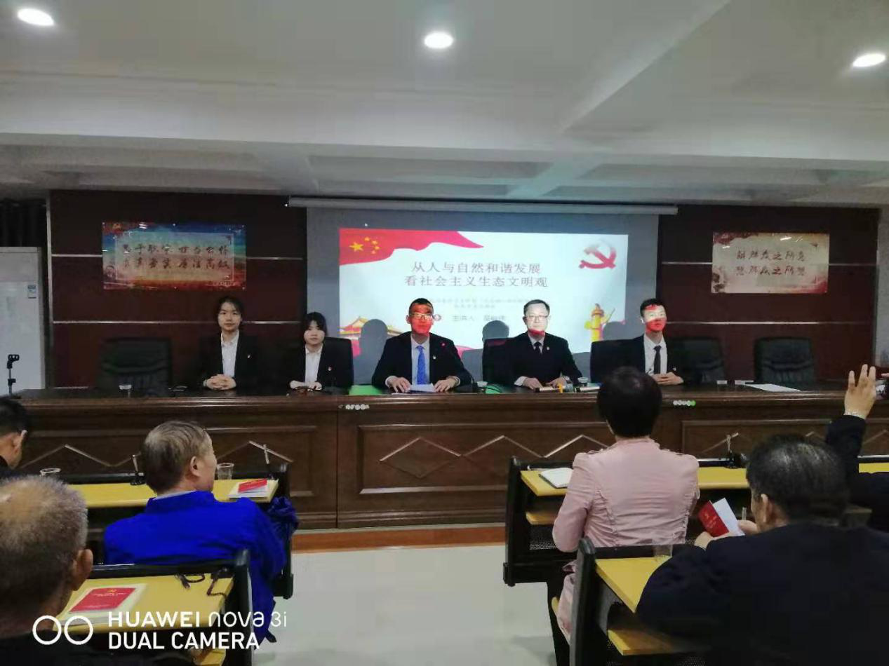 党课主讲人法学院苗峻伟主讲课题《从人与自然和谐发展看社会主义生态文明观》,他告诉我们,要因势利导地处理好人与自然的关系,开创生态文明新局面,同时,他还提到了“五个前所未有”和“四个新”,通过五大成就与四大要求来强调中国共产党人的初心和使命。宣讲过程中,无论是参与听讲的党员同志,还是在场的工作人员,大家都全神贯注、认真细致地在听取讲解。尹钟宏书记在观看过程中对宣讲团的首次宣讲以及参与宣讲的学生党员们给予了高度的评价和肯定,同时也希望同学们能取长补短,继续深化“不忘初心,牢记使命”主题教育。