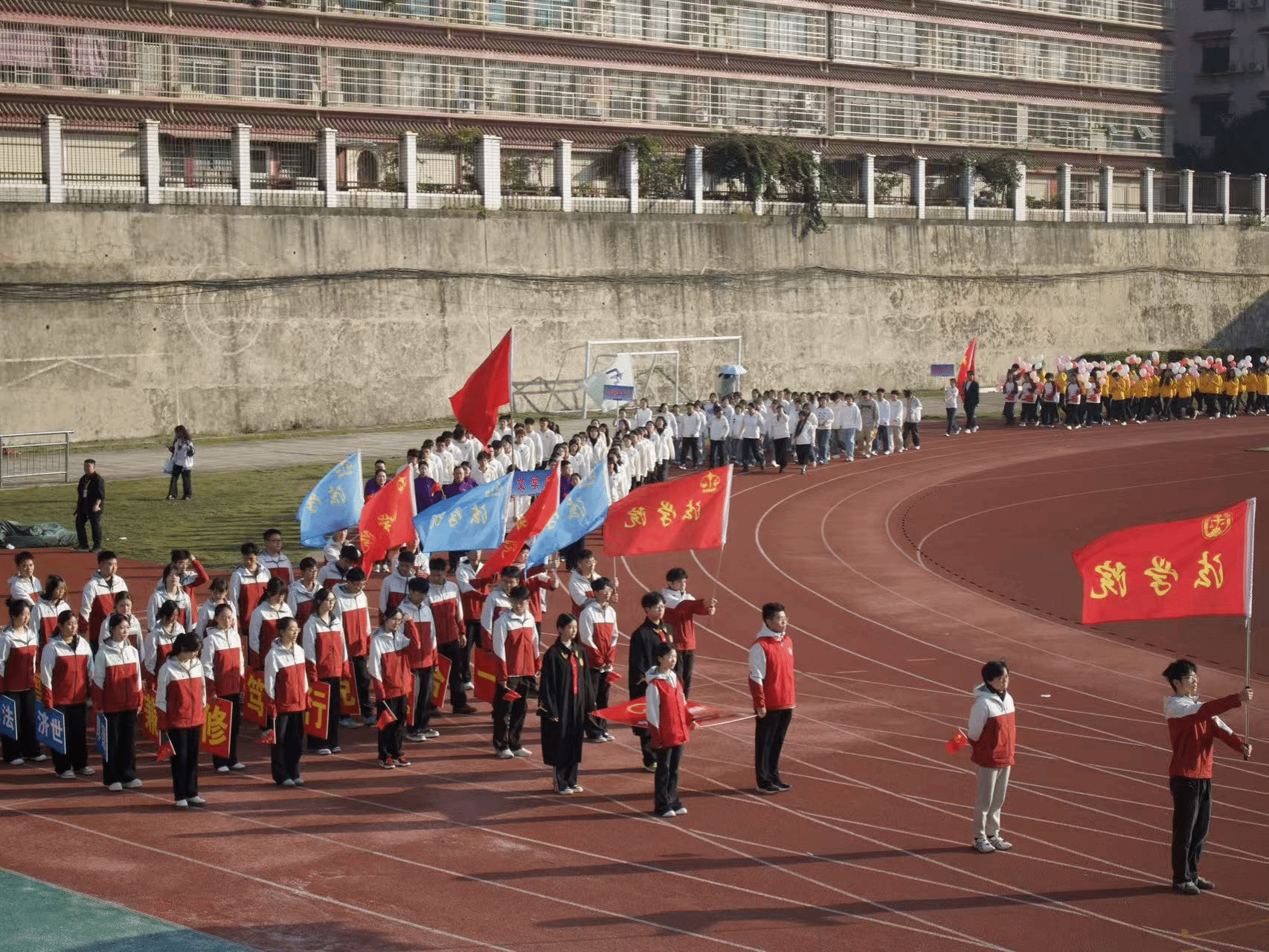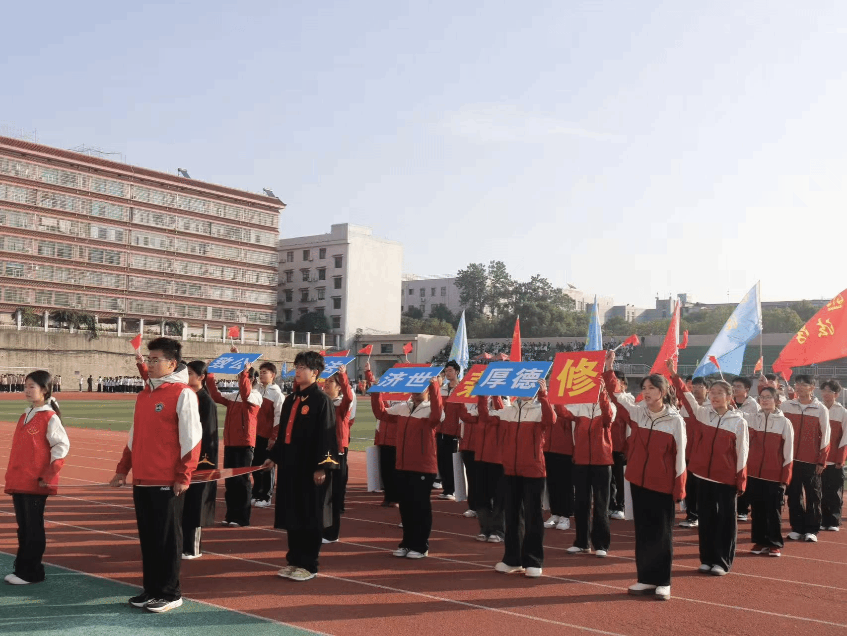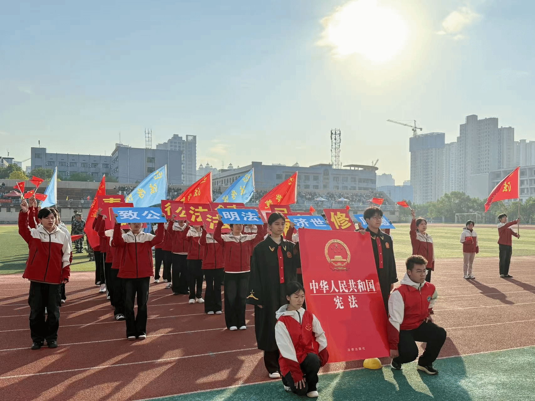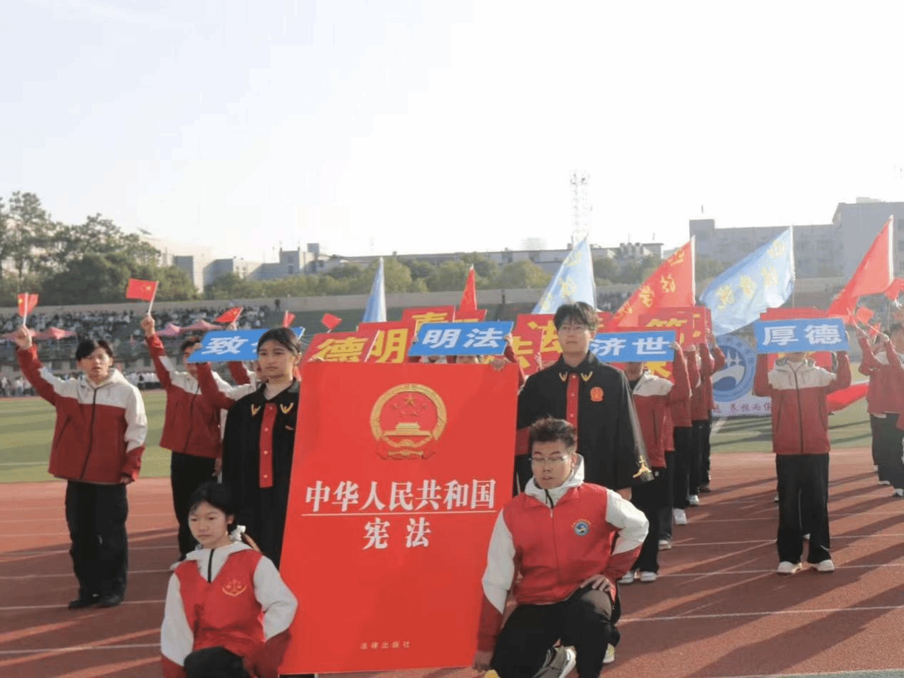 法学院方阵以青春之姿迈进运动场,学子们身着红白相间的运动装,与手持《中华人民共和国宪法》展牌的同学相呼应。他们高举“德法”“明法”“致公”等标语牌,在暖阳下喊出“德法兼修,明法笃行, 奉公克己,知行合一”的口号,步伐整齐如法典的条章,神情昂扬似正义的火炬。从法袍的庄重到运动服的蓬勃,从宪法展牌的肃穆到口号的嘹亮,法学院学子既诠释了“奉法者强”的专业底色,也彰显了“青春敢闯”的赛场锐气,将法律人的严谨与少年人的热血,一同写在了运动场的跑道之上。