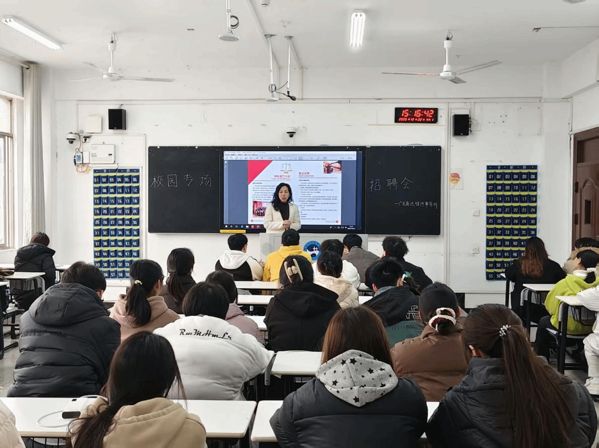 广东商达律所人事负责人刘经理介绍了律所基本情况,包括工作环境、业务模式、合作伙伴、薪资待遇等方面。此外,刘经理针对毕业生的困惑提出了专业性见解。宣讲完毕后有部分毕业生当场提交简历。