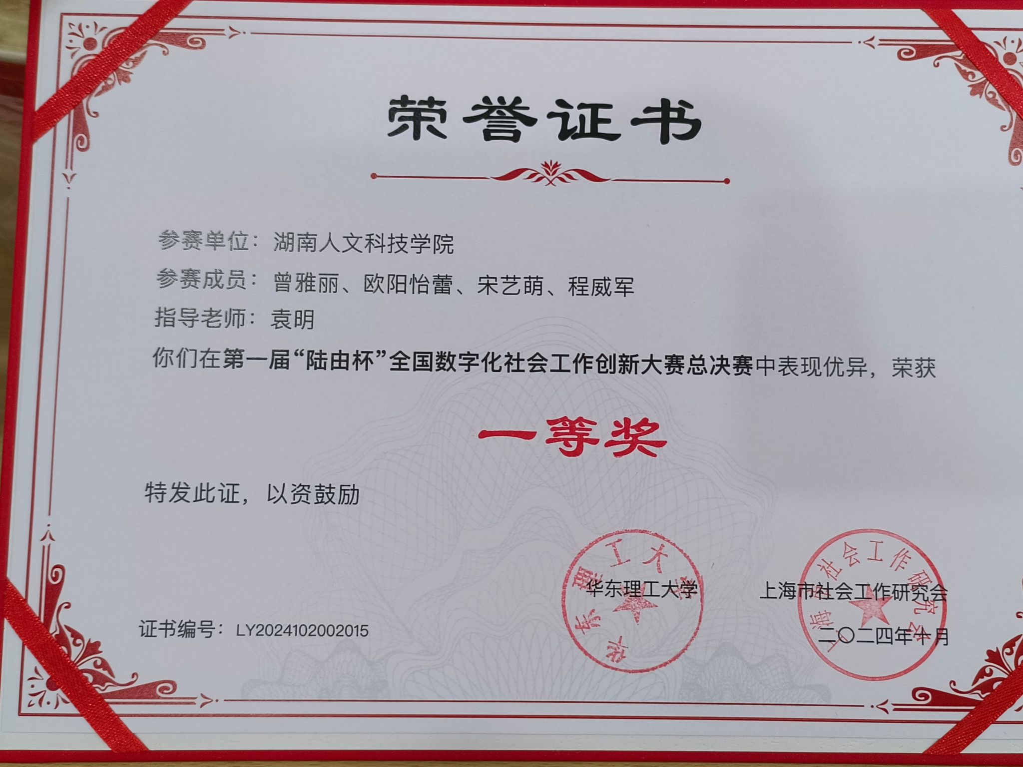 2024年10月20日,第一届“陆由杯”全国数字化社会工作创新大赛总决赛在华东理工大学精彩落幕。今年会社会工作专业团队经过激烈角逐,荣获总决赛一等奖。