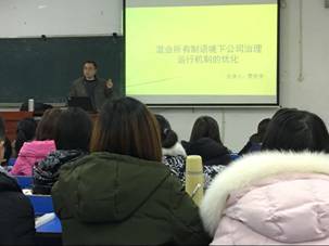 罗光宇老师结合《公司法》《证券法》等专业课程的相关内容,从三个方面深入阐述了当前着力推行混合所有制改革的必要性,特别强调指出在新语境下公司法理运行机制的优化路径。