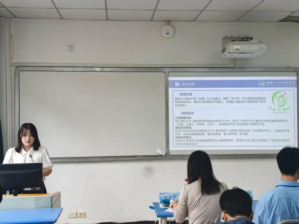 陈丁乐同学的研究旨在探讨社会资本对农村相对贫困群体心理健康的保护机制,深入分析其不同维度的差异化作用路径。基于中国家庭追踪调查(CFPS)2010、2014、2018、2022年四期面板数据,选取81,991个农村样本,采用调节效应模型、三维度分解模型、分位数回归等方法进行实证分析。研究结论表明,新时代农村相对贫困治理应超越单纯的经济扶持,构建“认知培育为主、关系支持为辅、组织参与为补”的差异化社会资本建设体系,并针对不同特征群体实施精准化的心理健康促进策略,以实现经济脱贫与心理脱贫的协同推进。李浩琦同学基于湖南“禾计划”,研究乡村儿童抗逆力提升。创新构建“需求—资源—服务”模型,通过精准识别、高效链接与专业服务提升儿童能力,为社工站提供可参考路径,具有优化基层治理、促进乡村振兴的实践价值。