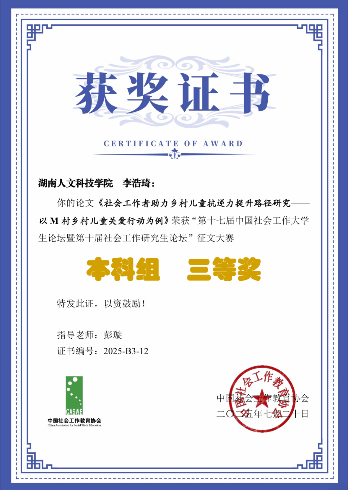 由中国社会工作教育协会主办、四川外国语大学承办的“中国式现代化与社会工作创新发展——第十七届中国社会工作大学生论坛暨第十届社会工作研究生论坛”在重庆隆重举行。此次论坛汇聚了来自北京大学、复旦大学、中国社会科学院大学等189所高校的450余名优秀学子,共赴这场学术盛宴。今年会社会工作专业学生陈丁乐、李浩琦同学的两项作品在众多优秀作品中成功突围。陈丁乐的《社会资本如何保护农村相对贫困群体的心理健康?基于结构、认知与关系三维度的机制分解——来自CFPS 2010-2022 的经验证据》论文和李浩琦的《社会工作者助力乡村儿童抗逆力提升路径研究——以M村乡村儿童关爱行动为例》论文荣获本科组三等奖。