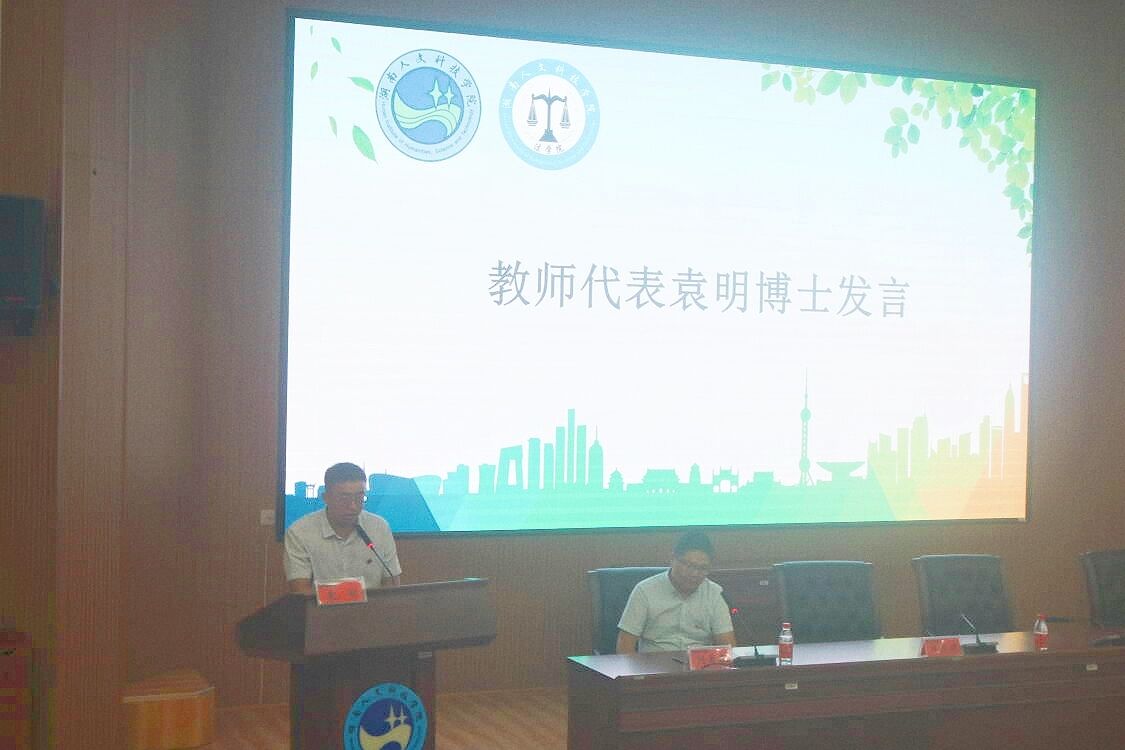 其后,教师代表袁明发表讲话,他首先强调了大学的重要性,并提出:认清自己,找准定位,找到真正的自己并为之奋斗;学会欣赏,点滴积累,勇于探索,用实际行动诠释大学生爱国的责任、情怀与担当;责任担当,有所作为。最后,袁明通过分享一则小故事,表达对法学院学子的期望与祝福。