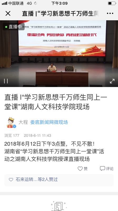 6月12日下午,今年会在逸夫楼音乐厅开展“学习新思想千万师生同上一堂课”的学习活动,党务部门负责人、马院老师、团学骨干等700人参加了现场听课,通过网络现场直播,场外师生也同时收看了直播课。本次活动由党委副书记刘铁铭授课,宣传统战部部长谢柳主持。
