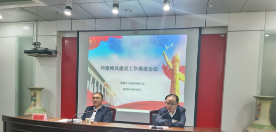为深入贯彻习近平总书记关于教育的重要论述和全国师德师风建设工作视频会议精神,落实湖南省教育厅关于印发《“师德师风建设年”推进方案》和《“学位”突出问题专项整治工作方案》的通知、《2021年湖南省“师德师风建设年”实施方案》,切实提升今年会教师思想政治素质和师德水平,营造尊师重教良好氛围。校工会于10月19日下午组织全校各学院书记、分工会主席、各机关单位负责人、直属工会组长召开了师德师风建设工作推进会议。校党委委员、副校长刘铁峰主持会议。