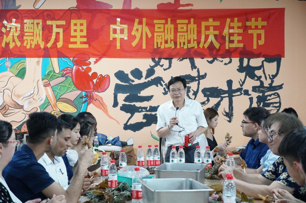 中国传统佳节端午节即将来临,为加强国(境)外人士了解中华优秀传统文化,增强中国传统节日的文化吸引力,感知中国共产党领导下人民群众生活水平的巨大提高,6月10日,国际合作与交流中心(港澳台办)组织了“粽香浓浓飘万里,中外融融庆佳节”端午节主题活动,副校长陈志国出席活动并致词,文学院院长倪正芳及部分教师代表,在校国(境)外专家、留学生代表,中外文化交流协会学生代表等50余人参加了本次活动。