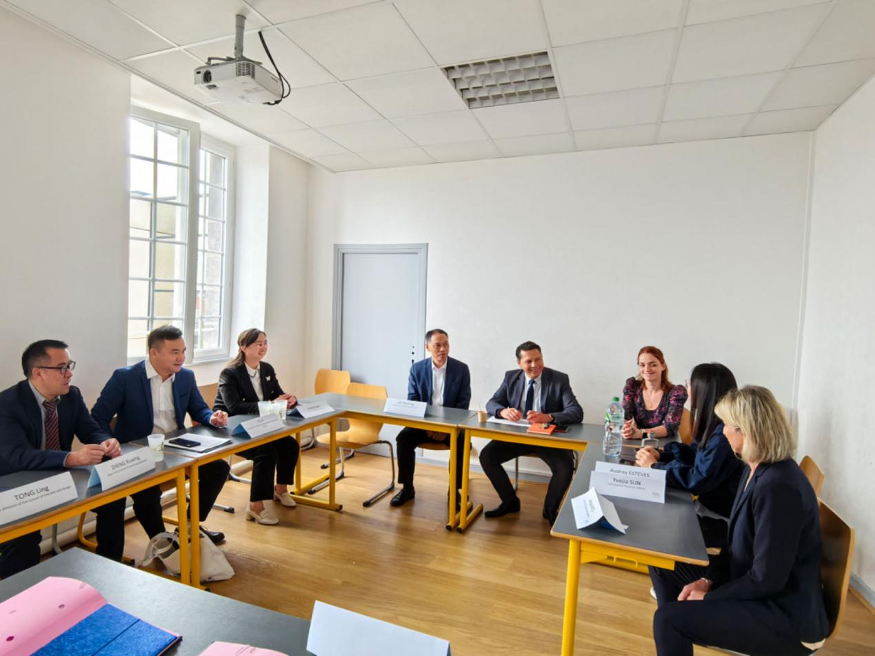 在法国克莱蒙高等商学院访问期间,刘铁铭一行与克莱蒙高等商学院校长Richard Soparnot教授、课程与学生管理部主任Anne Pats教授、国际关系部主任Audrey Esteves教授等进行了友好会晤,重点探讨了学生联合培养项目和继续教育培训项目,同时就人才培养、课程设计、互派教师、科研合作等方面进行了深入交流,并签订了合作协议。