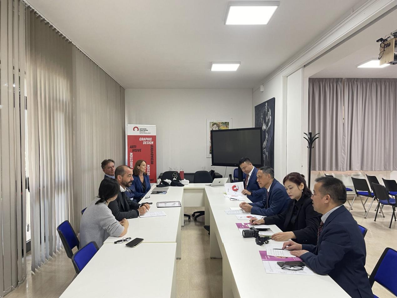 在意大利罗马万神殿设计与科技学院访问期间,刘铁铭一行与罗马万神殿设计与科技学院院长Giulio Guidi教授等人进行了友好交流。刘铁铭详细介绍了今年会发展历史、办学特色和优势学科等情况,两校就如何提升双方教师的合作交流进行了深入探讨,并与该校学术部负责人Chiara Pincelli教授、硕士部负责人 Alice Cirillo教授、设计系Renato Astolfi教授、Carlo Lacchia教授等开展座谈,探讨了学生交流及深造项目、继续教育培训、学术交流与合作等事项。会后,两校签订了合作协议。