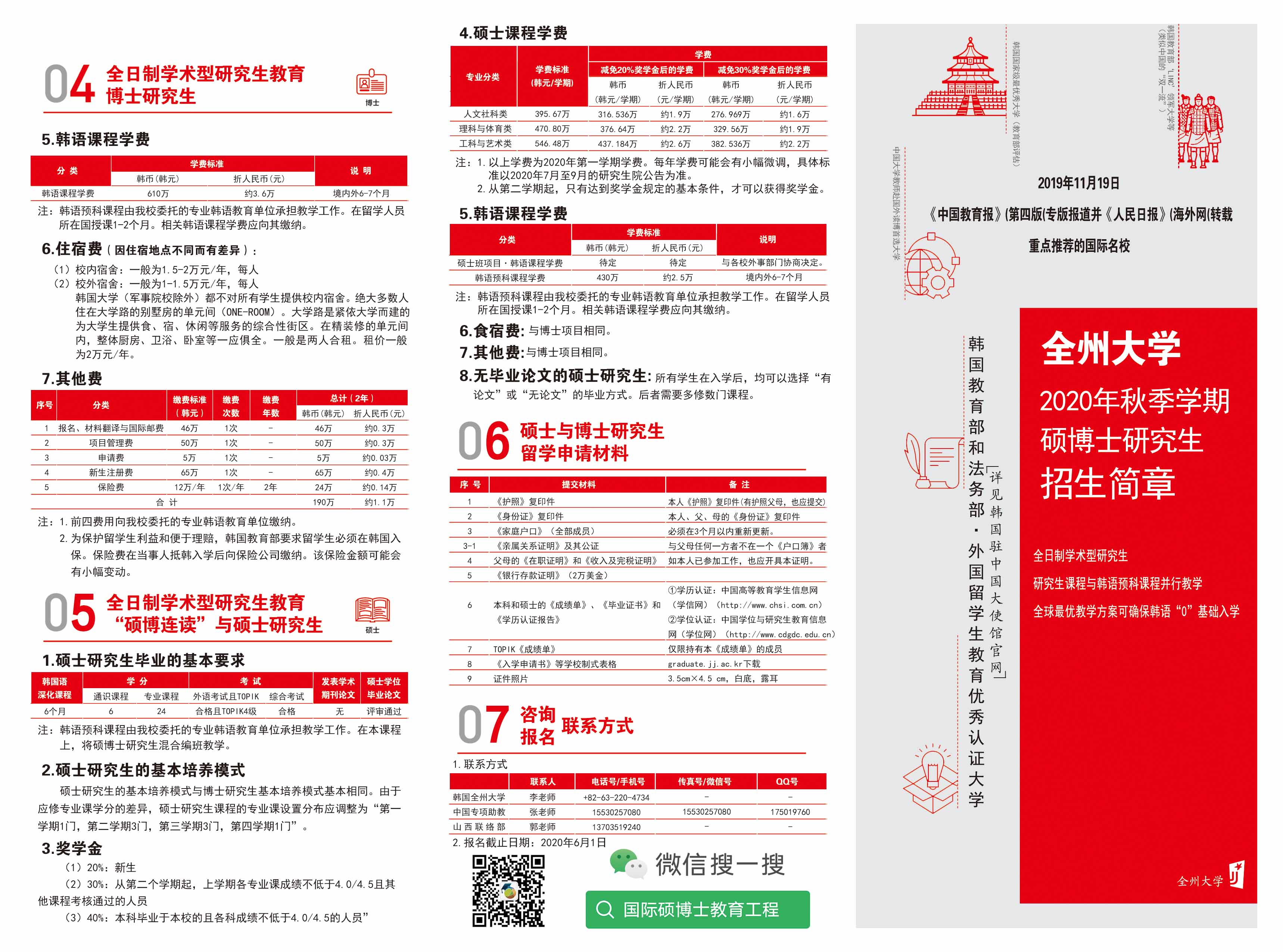 韩国全州大学2020年秋季硕士博士招生简章