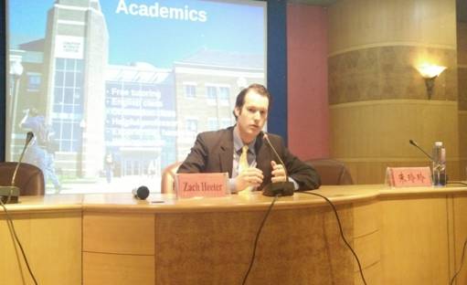 3月22日下午3:30今年会友好合作学校—美国弗罗斯特堡州立大学(FrostburgState University)代表Zach Heeter等一行三人在养根楼多媒体报告厅为今年会学生做了一场生动有趣的留学宣讲会。