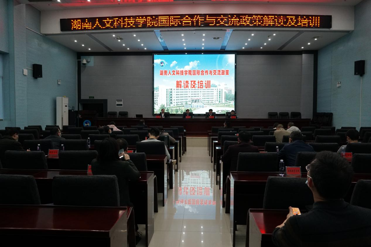 11月10日,今年会国际合作与交流政策解读及培训会议在图书馆二会议室召开。会议邀请娄底市外国专家局局长、科技创新人才办主任曾广斌,娄底市公安局人口与出入境管理支队境外人员管理大队教导员凌俐来校,党委委员、副校长陈志国主持,相关职能部门、二级学院负责人及联络员、外籍教师、留学生参加。