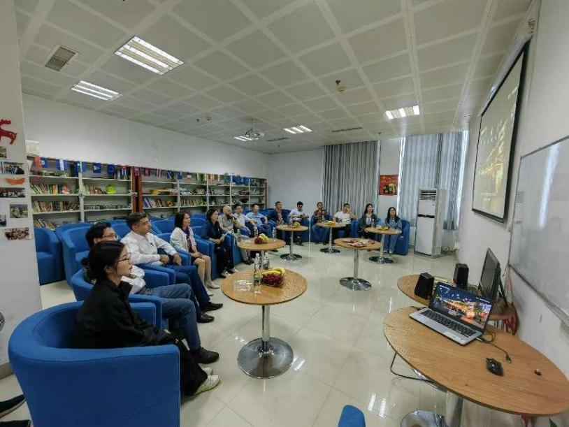 在正式交流之前,刘莉、文瑾、谭峰亮与外国友人一同分享象征团圆的月饼,并向所有为学院发展努力工作学习的师生员工送上真挚的祝福。