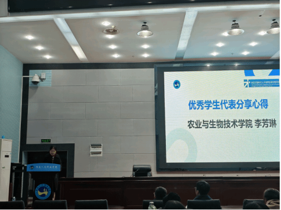 会末,国际班优秀毕业生代表李芳琳给学弟学妹们分享了自己在国际班的学习历程和体会,讲述自己通过参加该项目在专业学识、国际视野上得到的成长。她的分享让在场同学们真切感受到项目的魅力与价值,也激励着大家为成为国际化人才而努力拼搏。
