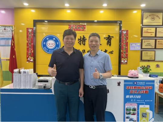 In Dongguan, Liu Heyun and his entourage exchanged views with Association President Zeng Xiaodong, Li Juan, Wang Chenghao and other alumni, and visited Huate Education Group. Wang Haoping, the group president,sincerely thanked HUHSTfor recommendingtalents in the past 13 years. 98 alumni havejoined Huate, and the peak amountof alumni employees reached more than 50 before. Liu Heyun deeply understood and gave high praise to the educational,business philosophy and enterprise culture of Huate Education. Seeing that the alumni on site have gained a lotin Huate Education, and now distributed invarious important positions of the group, becoming the backbone of the enterprise, Liu Heyun is full confidentfor the futureschool-enterprise cooperation with Huate Education.