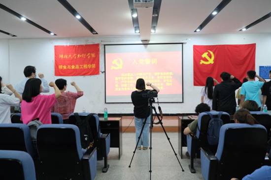 大会在庄重的国歌声中正式拉开帷幕,并在庄严的党旗之下由学生党员万晴领誓,全体党员重温入党誓词,紧接着祝方清书记从实际出发,表达了作为老党员对我们青年一代的鼓励与期盼。