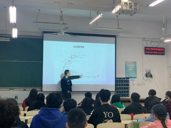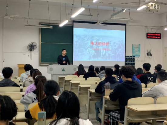 课堂上,王刚处长带领同学们回顾两万五千里漫漫长征路,红军穿越人迹罕至的大西南大西北,路途之不易;分析湘江战役的形势,战斗之激烈,伤亡之惨重;讲述遵义会议为何是中国共产党生死攸关的转折,如何挽救了我国的革命;感受毛泽东同志一路走来直至成为全党领导核心的曲折历程。展现了我党坚持结合实际、分析局势、坚持真理,即使“摸着石头过河”,依然坚定胜利的信念,坚持走中国化道路。王刚处长在结束时讲到,历史反映的是先辈们的血泪经验,而今,相信随着中华民族伟大复兴不可逆转之历史进程的持续推进,全党全国各族人民志气、骨气、底气的日渐增强,我们在新时代持续弘扬伟大长征精神,知难而进、迎难而上,一定能够全力战胜前进道路上各种困难和挑战,依靠顽强斗争打开事业发展新天地。