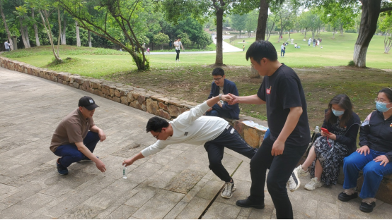 最后,两队的排雷代表郭雅纯和曾仕林在队员们的协助下,成功将模拟的地雷从“雷区”中安全取出放置到指定位置,完成了紧张的“排雷”任务。通过这些游戏活动,加强了团队成员之间的相互交流,培养了团队合作意识,提升了整体团队能力。