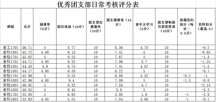 各班级团支部代表汇报了过去一年团支部建设情况和取得的成绩,并接受评委和现场观众的质询,最终,结合各班级团支部日常考核得分和现场答辩得分,食检1701Z和食工1701Z班级团支部获得“优秀团支部”称号并将向院团委推荐参评学院优秀团支部。