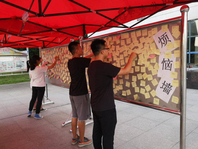 青春韶华,心事几何;温暖心灵,与爱同行。“5.25”粮工学院游园会——烦恼墙5月22日早上8:00在知新楼门口火热开展,同学们积极参与,将自己的烦恼写在卡片上,张贴在烦恼墙上;用文字语言,说出自己的烦恼,在烦恼墙上“留”下他们的心事,带走我们粮工的温暖。粮工学院借“5.25我爱我”心理健康教育月的时机,宣传心理文化知识,普及心理健康常识,呼吁大学生关注自身的心理健康状况。