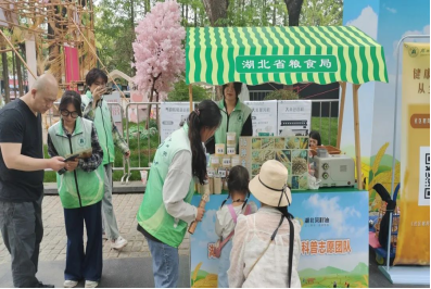 4月19日,由湖北省粮食局主办、湖北荆楚粮油股份有限公司承办的"荆楚好粮油·健康传万家"全谷物科学膳食宣传推广活动在武汉市武昌区汉阳门花园举行,粮工学院全谷物志愿者积极参与活动。