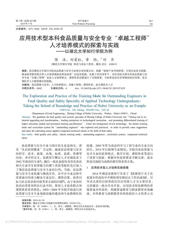 食品质量与安全专业教学团队致力于培养具备现代食品安全与质量控制基本理论、基本知识和技能,能从事农产品、畜产品、水产品原料及加工制成品安全及质量控制、无公害食品生产模式设计、绿色食品和有机食品生产和监督管理、生物技术污染与控制、食品卫生检验与监督以及食品安全研究和管理工作的应用型高级技术人才。拥有专职教师人数7人,其中副高级及以上职称5人,中级职称2人,“双师型”教师3人。专业团队以功能性食品创新平台、粮油加工工程研究中心创新平台,着力将本专业打造为省级实习实训基地、校企合作优秀科研团队、应用型人才培养示范专业。