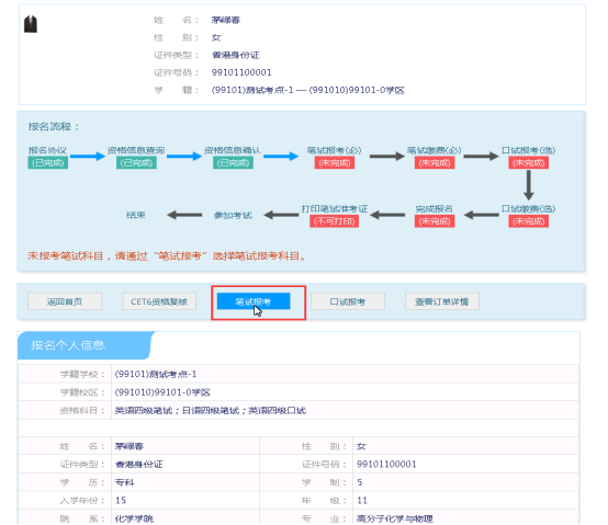 在考生报名信息页面,点击“笔试报考”按钮,进入笔试报考页面