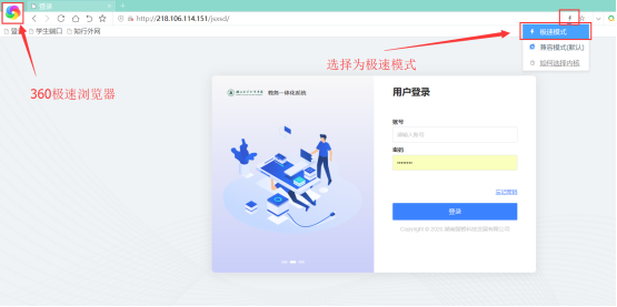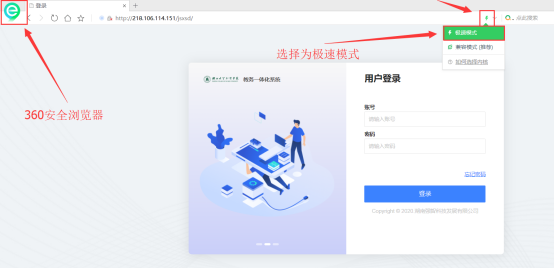 推荐使用谷歌浏览器,若使用360浏览器,请将浏览器模式设置为极速模式,如图进行设置: