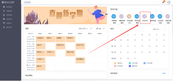 第三步:登录完成后,进入个人主页点击右上角“学生评价”,选择本次教学考评活动,选择老师后进行评价。