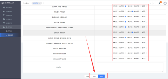 评价完成后,点击“保存”或者“提交”,当选择“保存”时,仍可以进行修改,但点击“提交”之后,不可再进行修改,请确保完成所有老师的评价。