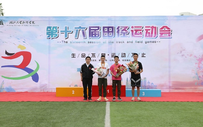 学校党委书记彭德忠为女子铅球获奖者颁奖