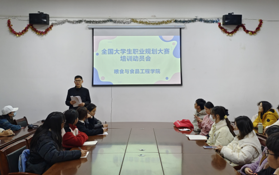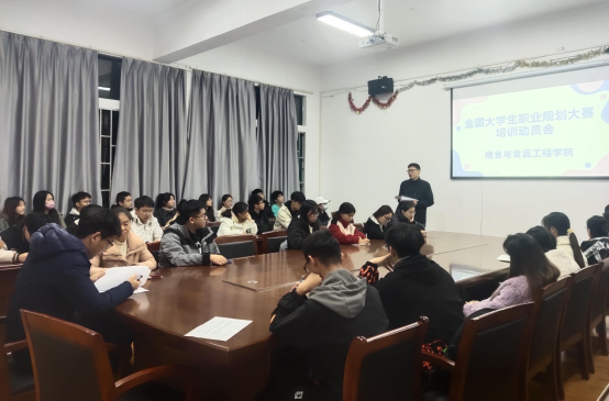 为确保首届全国大学生职业规划大赛院级初赛顺利开展,切实增强学生职业生涯规划意识,树立正确的成才观、就业观,提高就业技能和实践能力,粮工学院组织召开大赛培训动员大会,会议由学院党总支副书记冯书祥主持,辅导员郭雅纯、殷茂胜和全体在校班级代表参加。