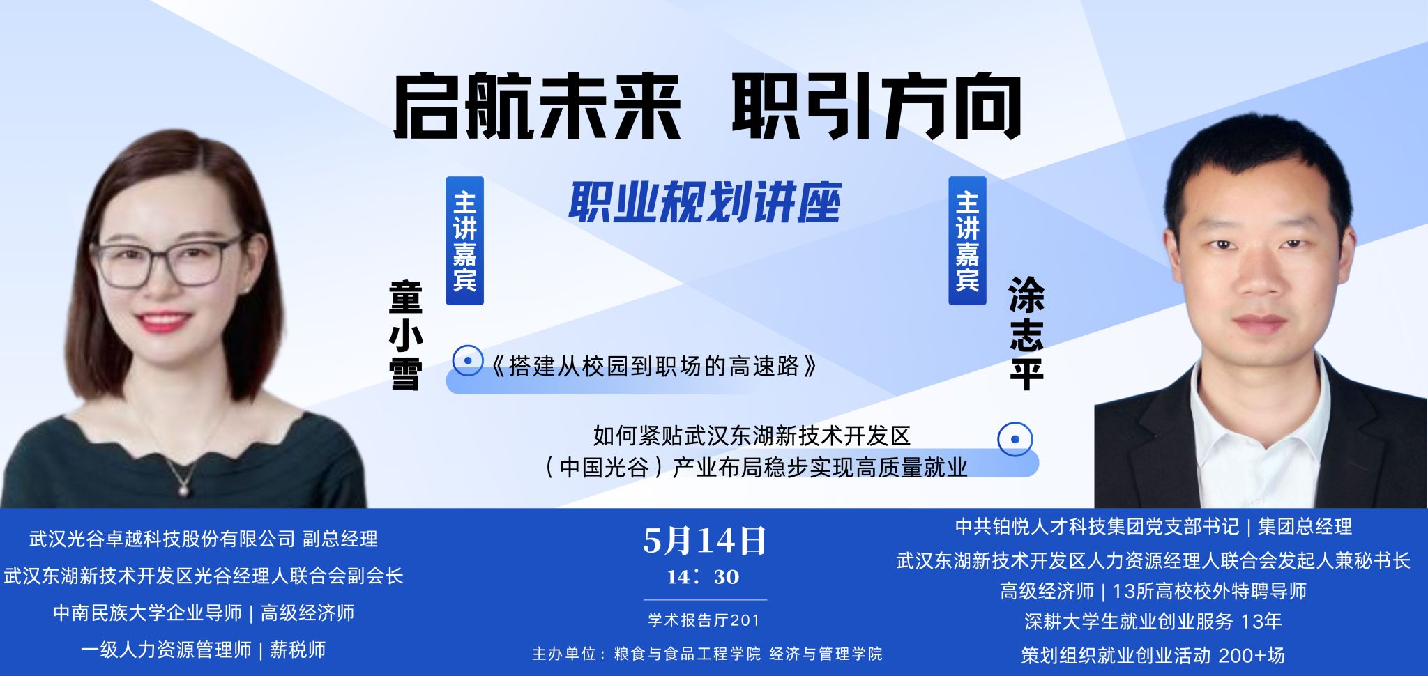 第一位嘉宾是涂志平先生,他身兼数职,是中共铂悦人才科技集团党支部书记、集团总经理,武汉东湖新技术开发区人力资源经理人联合会发起人兼秘书长,同时也是 13 所高校的校外特聘导师。涂志平先生深耕大学生就业创业服务领域 13 年,策划组织了 200 余场就业创业活动,积累了丰富的行业经验。他以《如何紧贴武汉东湖新技术开发区(中国光谷)产业布局稳步实现高质量就业》为主题进行讲座,从宏观的产业布局视角出发,深入剖析光谷地区的就业形势与潜在机遇,为同学们提供了极具价值的就业指导。